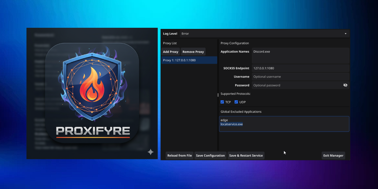 The ProxiFyre Configuration Manager is a modern Windows GUI application built to simplify managing the underlying SOCKS5 proxy configurations. It transforms a command-line utility into a user-friendly tool, offering a visual interface that helps you manage your entire proxy setup.